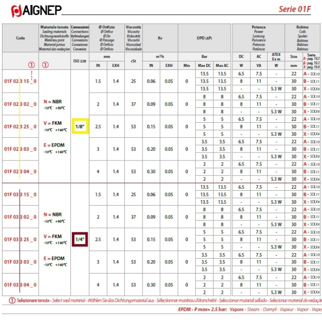 Pro výběr vhodného Solenoidu je zapotřebí zvážit 6 hlavních parametrů: 1. Napětí, 2. Výkon (W), 3. Řízený průtok (m3/hod.), 4. Typ otevření (NC/NO - v základu uzavřen/otevřen).5. Těsnění dle druhu média např.: NBR - voda, inertní plyny, FKM - paliva (+140°C), EPDM - horká voda a pára (+140°C). 6. Průměr solenoidového hřídele (tato řada 01F má 10 mm).Palivem jsou míněny: minerální oleje, benzín, nafta, topný olej apod.Vrtání DN (JS) vykazuje tabulkově tyto hodnoty průtoků: DN 1,5 = 60 l/hod. (1 l/min.), DN 2 = 90 l/hod., DN 2,5 = 150 l/hod., DN 3 = 200 l/hod., DN 4= 300 l/hod.