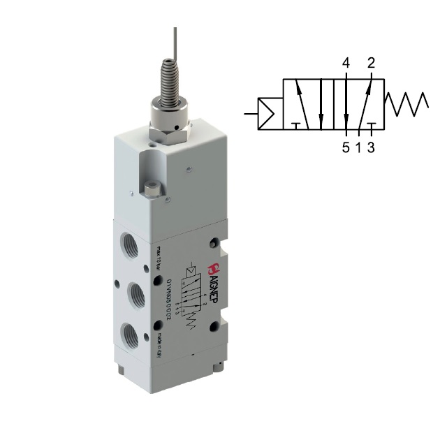 Slouží k ovládání stlačeného vzduchu pneumatických válců nebo ovládání jiných pneumatických mechanismů. 5/2 - počet cest/počet úloh, resp. pěticestný/dvoupolohový ventil.Ventil je ovládán jednostranně.Ventil se volí pro míst, kde ovládací mechanický pohyb bývá delší než délka táhla ventilu, nebo ovládací tažný pohyb (většinou rotační) mění úhel než je osa pístu ventilu.G 1/8 - 740 NI/min.