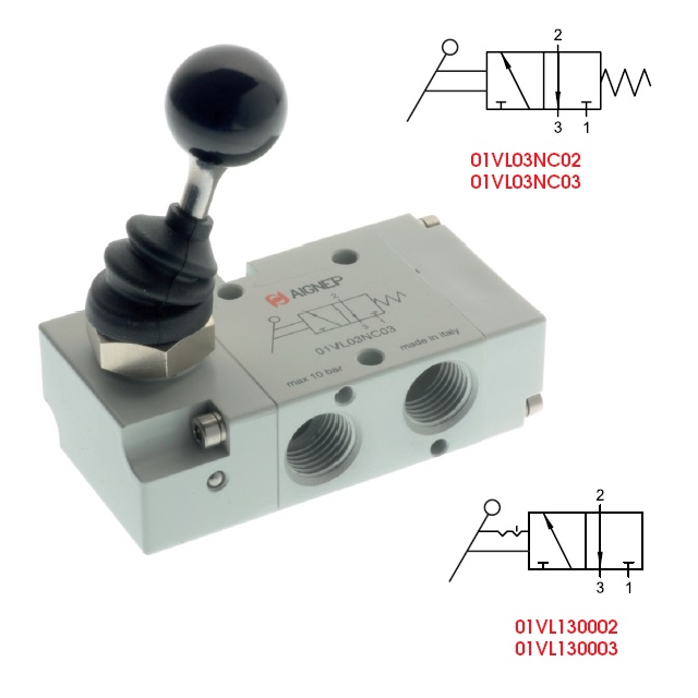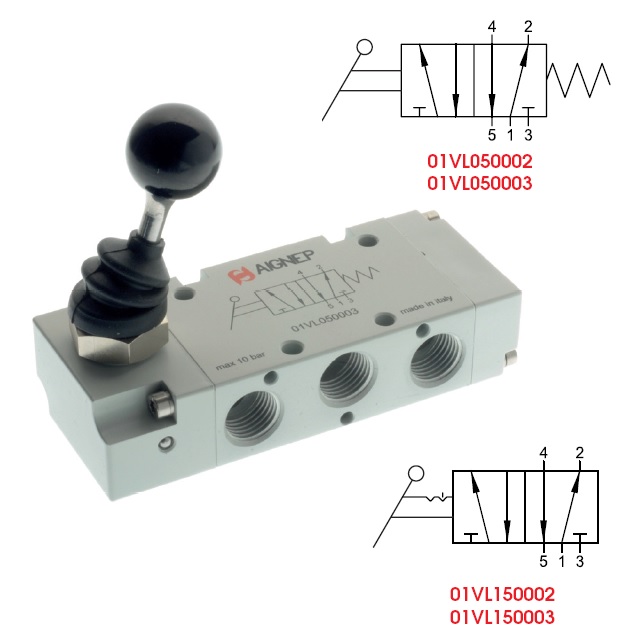 Slouží k ovládání stlačeného vzduchu pneumatických válců nebo ovládání jiných pneumatických mechanismů. 5/2 - pěticestný jednostranný s vratnou pružinou - 01VT05 (monostabilní bez aretace).5/2 - pěticestný oboustranný, dvoupolohový, bez pružiny - 01VT15 (bistabilní s aretací polohy).G 1/8 - 740 NI/min, G 1/4 - 1200 NI/min.