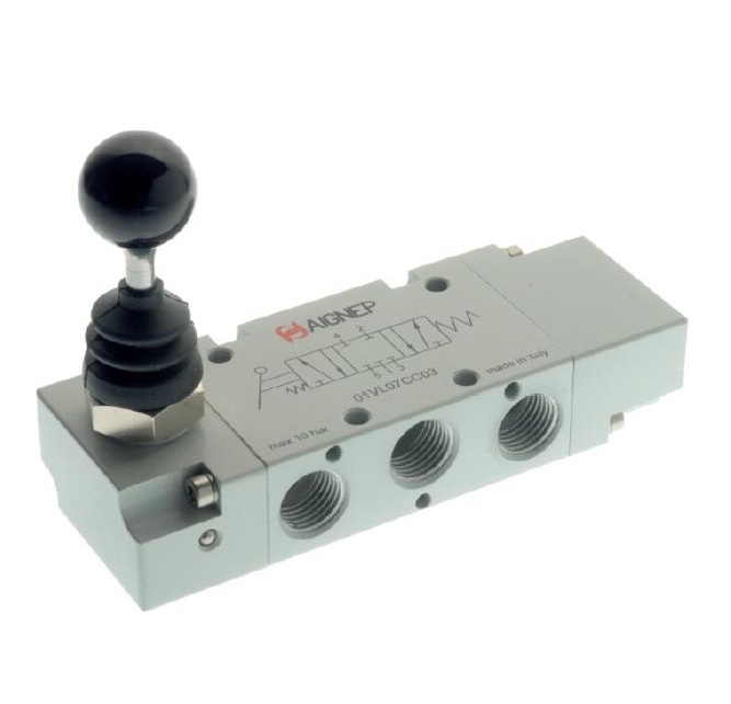 5/2 - pěticestný/dvoupolohový.G 1/8 - 740 NI/min; G 1/4 - 1200 NI/min.Ruční jednostranný (monostabilní bez aretace-L0) a oboustranný (bistabilní s aretací - L1) ventil s páčkou.