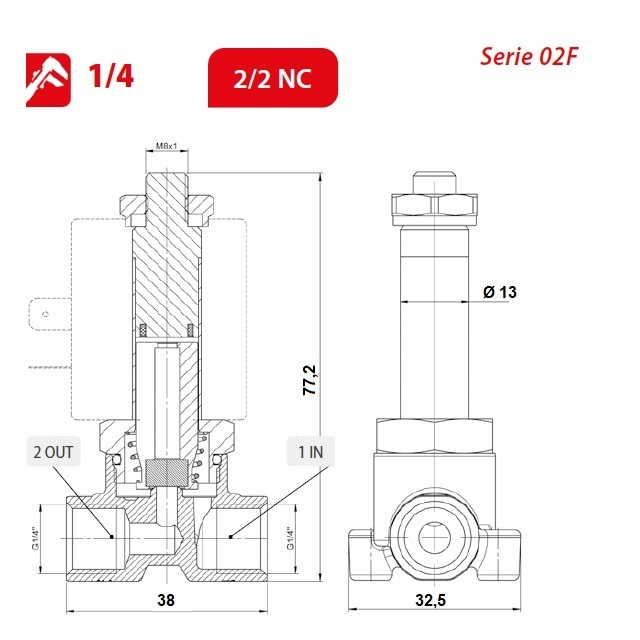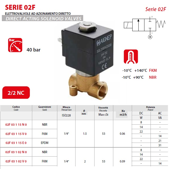 Přímo řízený ventil s funkcí 2/2 NC (2 úlohy, 2 cesty, v základním stavu zavřený ventil). Základní, mechanická část "Solenoidu prům. 13 mm" je určena pro stejný průměru otvoru cívky 13 mm. Průtok média omezen otvorem za závity "2 IN" [mm]. Ovládáním elektrického solenoidu se průtok zvětšuje do jeho maxima, které je v tabulce uvedeno ((v barevném (jiném) odlišení). Hodnoty delta průtoku a delta tlaku lze vyhledat v originálním katalogovém listu výrobce. Řídká média: Maximální viskozita média je uváděna 53 cSt.