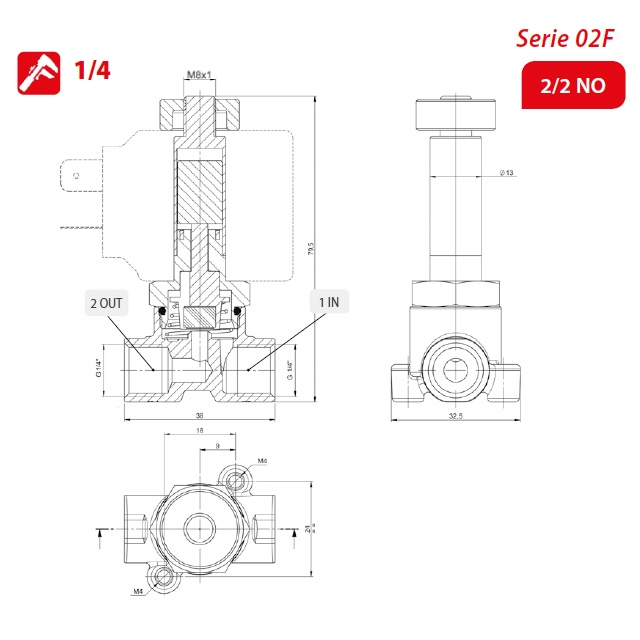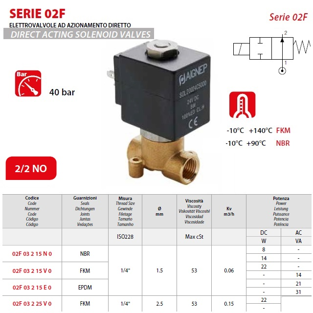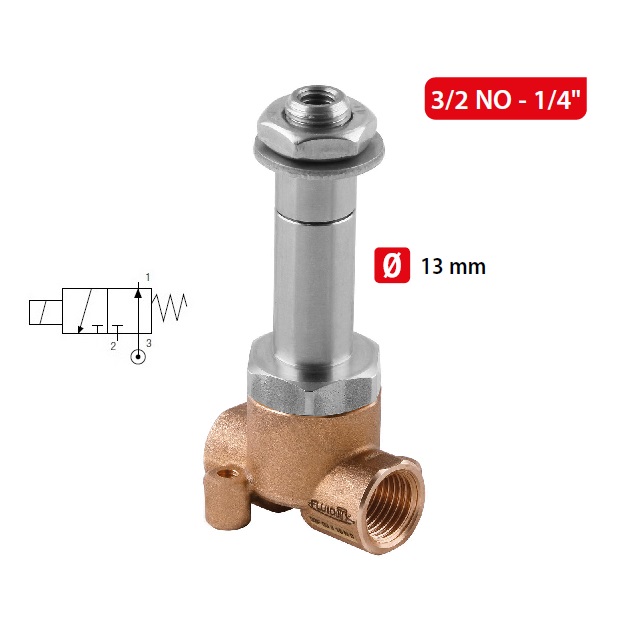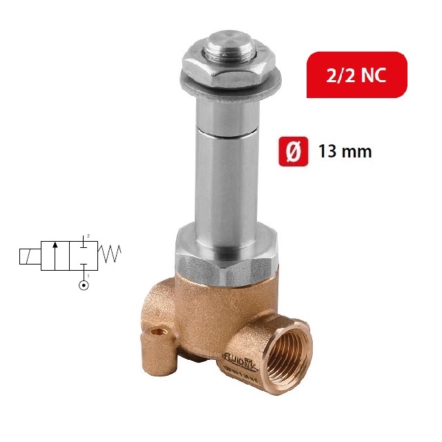Přímo řízený ventil s funkcí 2/2 NO (2 úlohy, 2 cesty, v základním stavu otevřený ventil - 1 IN>2 Out). Základní, mechanická část "Solenoidu prům. 13 mm" je určena pro stejný průměr otvoru cívky 13 mm. Volba typu ventilu: D* - Průtok média je také konstrukčně omezen vrtáním "1 IN" [mm], maximum bez omezení uvádí tabulka průtoku. Ovládáním elektrického solenoidu se průtok snižuje dle příkonu až do jeho minima. Hodnoty delta průtoku a delta tlaku dle různých příkonů cívky lze vyhledat v originálním katalogovém listu výrobce, nebo jej na zažádání zašleme. Řídká média: Maximální viskozita média je uváděna 53 cSt.