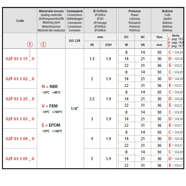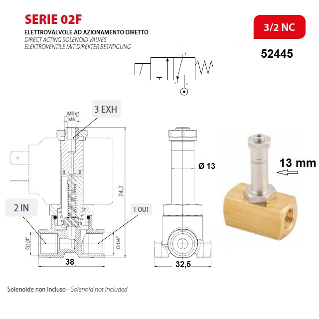 Přímo řízený ventil s funkcí 3/2 NC (3 úlohy, 2 cesty, v základním stavu zavřený ventil). Základní, mechanická část "Solenoidu prům. 13 mm" je určena pro cívku stejnéjo průměru otvoru "13 mm". V základním stavu "NC" je protok média omezen otvorem za závity "2 IN" [mm]. Ovládáním elektrického solenoidu se průtok zvětšuje do jeho maxima, které je v tabulce uvedeno ((v barevném (jiném) odlišení). Hodnoty delta průtoku a delta tlaku lze vyhledat v originálním katalogovém listu výrobce. Výběr cívek: Podstatným údajem při výběru solenoidu je průtok, vrtání a síla cívky, která ho ovládá. *D: Ovládáním 3 EXH se řídí otevření do max. výtupu (1 OUT), kde je pro všechny typy stejné vtrání 1,9 mm, viz originální katalog. Řídká média: Maximální viskozita média je uváděna 53°.