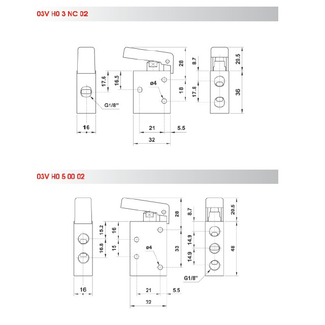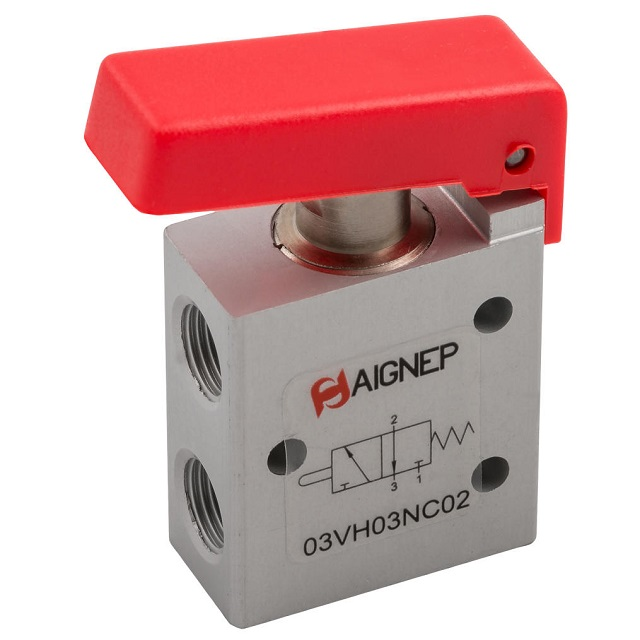 Varianty03VH03NC02; Provozní tlak (bar) 2-10, Vnitřní závit G 1/8", Hmotnost (kg) 0,06, Velikost [modul] 3/2 ventil, Ovládání NC - normálně zavřený