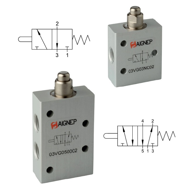 Slouží k ovládání stlačeného vzduchu pneumatických válců nebo ovládání jiných pneumatických mechanismů. 3/2 - počet cest/počet úloh, resp. třícestný/dvoupolohový ventil, ventil 16 mm, NC-normálně uzavřen.5/2 - počet cest/počet úloh, resp. pěticestný/dvoupolohový ventil, ventil 16 mm.G 1/8 - 350 NI/min.