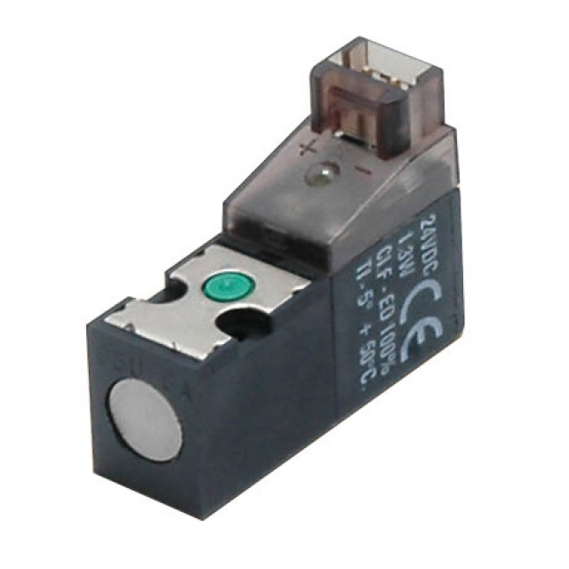 Mini ventil řady 07V šíře 10 mm je určený k desce 07V1B (55366), kde konektory jsou v úhlu 90° k desce .Stejný ventil s konektory v linii má AIGNEP číslo 07V113****, s kabely 300 mm 07V133****Základní stavy: NO / NC s varianty 12 nebo 24 V.Ventily mají reakční schopnost až 2700 cyklů za minutu s životností přes 50 miliónů cyklů.