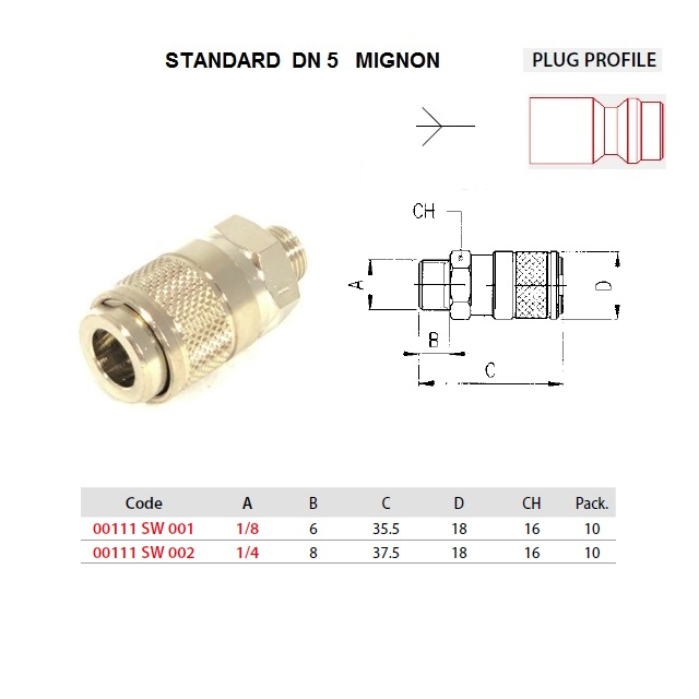 Varianty111SW001; Celková délka (mm) 35,5, Provozní tlak (bar) 12, Série Série 110, Vnější závit G 1/8", DN (mm) 5, Ventil NE, Hmotnost (kg) 0,033, Šestihran 16