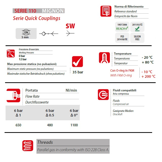 Rychlospojky Série 110 jsou kompatibilní pouze mezi sebou se vsuvky při DN 5 a stejného profilu MIGNON. Nelze je tedy spojovat či zaměňovat s jinými výrobci bez této normy. V případě požadavku Vitonového těsnění je spojky možné použít v rozsahu teplot -10°C až + 200°C. Mají četná evropská schválení a neobsahují silikon.
