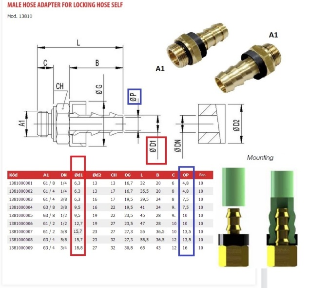 Varianty1381000001; Provozní tlak (bar) 148, Vnější závit G 1/8", Hmotnost (kg) 0,012, Šestihran 13, Určeno na hadici [mm] 6,3 (1/4)