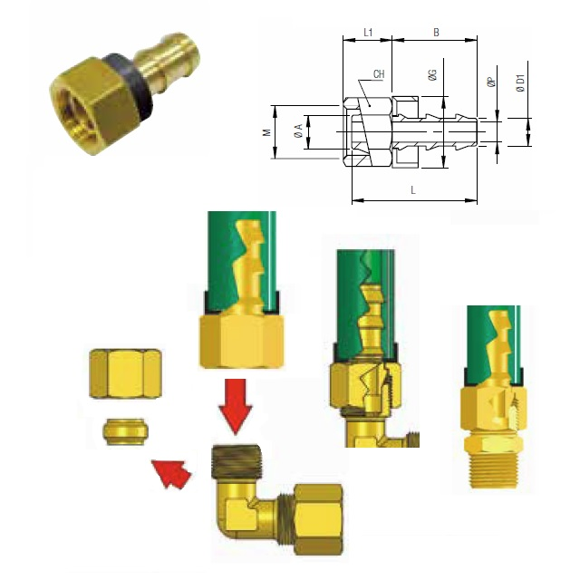 Mosazná úhlová s gumičkou pro vodu, oleje nebo vzduch do 150 bar (-20/+80°C)