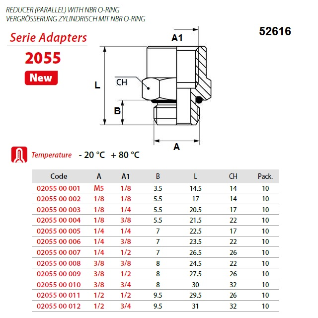 Varianty205500001; Celková délka (mm) 14,5, Provozní tlak (bar) 50, Vnitřní závit G1/8", Vnější závit M5x0,8, Délka závitu (mm) 3,5, Hmotnost (kg) 0,011, Šestihran 14