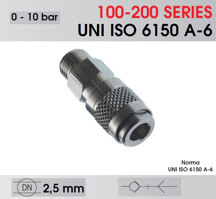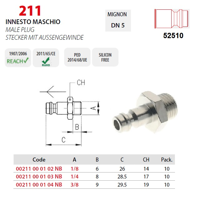 Varianty211000102NB; Celková délka (mm) 26 mm, Provozní tlak (bar) 12, Série Série 110, Vnější závit G 1/8", DN (mm) 5, Ventil NE, Hmotnost (kg) 0,012, Šestihran 14
