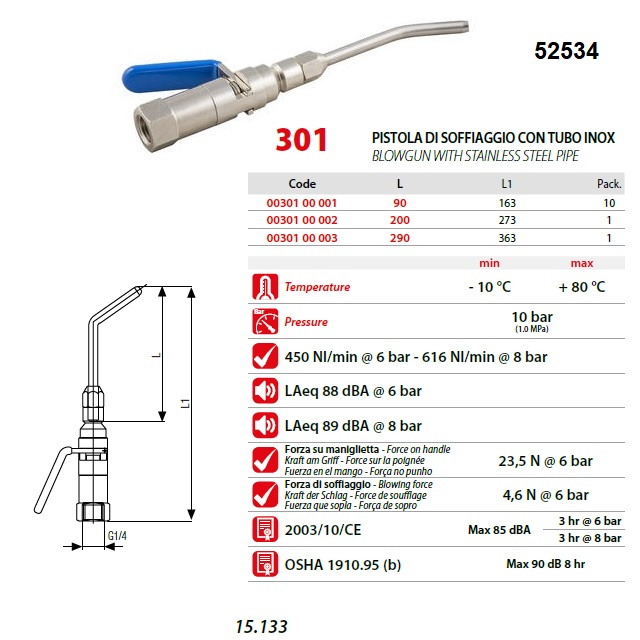 Ofukovací pistole na vzduch jsou certifikované několika normy, viz katalogový list Série 300. Při 8 barech je průtok 616 l/min (89 dBA), při 6 barech 450 l/min. 88 dBA. Foukací síla 4,6 N / 6 Bar. Zpětný ráz - síla na rukojeti je 23,5 N / 6 Bar.Pistole této řady 10 Bar se liší pouze délkou bezpečnostní hubice.