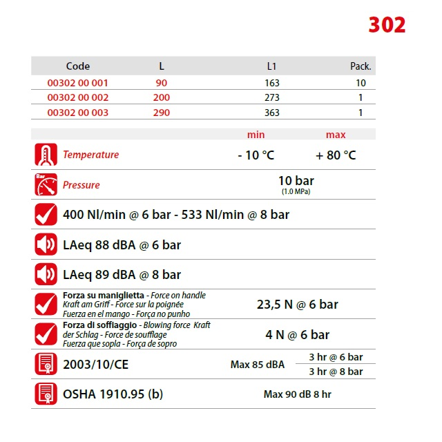 Ofukovací pistole na vzduch jsou certifikované několika normy, viz katalogový list Série 300. Při 8 barech je průtok 533 l/min (89 dBA), při 6 barech 400 l/min. 88 dBA. Foukací síla 4 N / 6 Bar. Zpětný ráz - síla na rukojeti je 23,5 N / 6 Bar.Pistole této řady 10 Bar se liší pouze délkou bezpečnostní hubice.