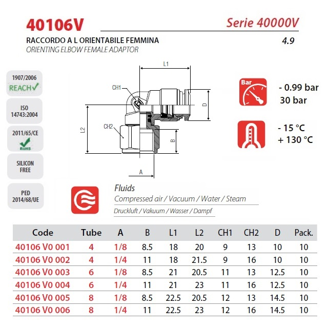 Jde o Push-In koncovku pro potravinářské a farmaceutické účely. Použití k dopravě páry, vody, potravinářských kapalin nebo sání stupně vakua.