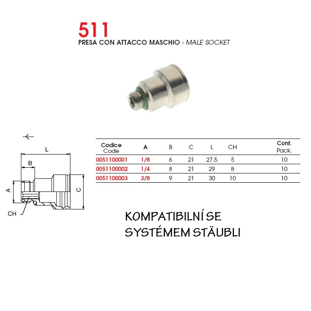 Varianty51100001; Provozní tlak (bar) 15, Vnější závit 1/8", DN (mm) 8, Hmotnost (kg) 0,02, Šestihran 5