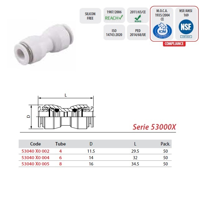 Série roku 2023, označená 53000X májí všechny potřebná potravinářské schválení jako 1934/2004/CE, NSF 169, DM 174 apod.Jsou vhodné pro pitnou vodu 20 bar, páru nebo podtlak 0,99 Kpa. Ideální pro přímý kontakt s potravinovými tekutinami.Vhodné mohou být i ve farmaceutickém průmyslu.Kalibrované hadice můžete volit z materiálu PTFE, PE nebo PU potravinářské kvality.