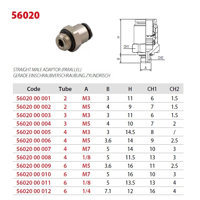 5602000004; Provozní tlak (bar) 20, Vnější závit M5x0,8, Hmotnost (kg) 0,003, Ovládání Imbus 2,0, Určeno na hadici [mm] *D3 mm