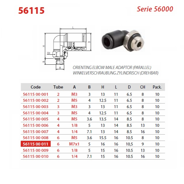5611500005; Provozní tlak (bar) 20, Vnější závit M5x0,8, Délka závitu (mm) 3,6, Hmotnost (kg) 0,002, Šestihran 8, Určeno na hadici [mm] 4, Kóta B 13,5
