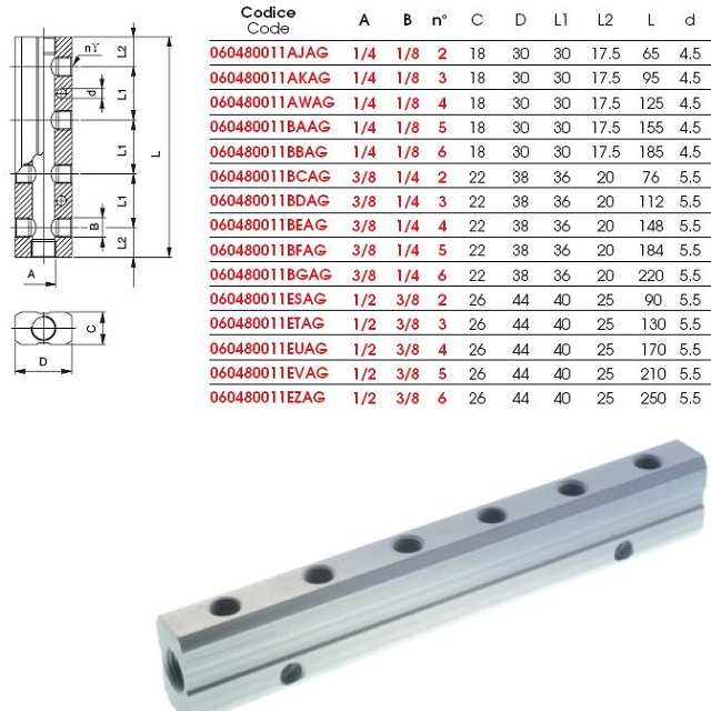 Varianty60480011AJAG; Provozní tlak (bar) 15, Rozměr vnit. závitu (mm) 2x2 G 1/8", Vnitřní závit 2x G1/4", Šířka (mm) 18, Vstup (otvor) (mm) n° - 2, Hmotnost (kg) 0,05, Kóta B 30