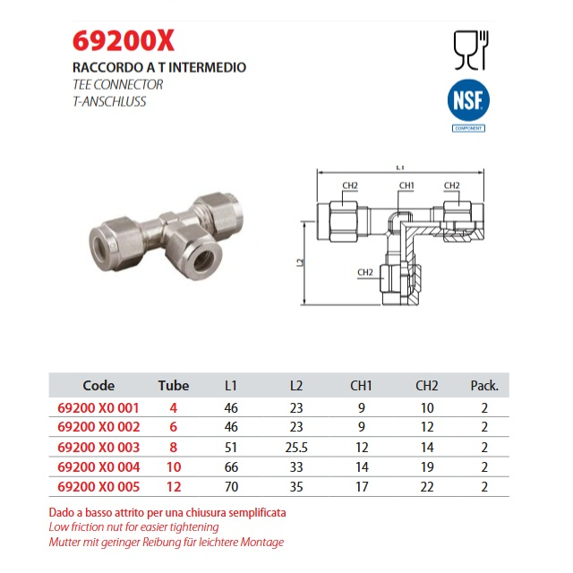 NOVÁ ŘADA 69000X - má náběhovou stranu matice ukosenou pro lepší a rychlejší nasazení klíče pro robotické systémy. Teplota šroubení -60°/+300°C je limitována těsněním do 190°C. Kompatibilní s trubky z materiálů nerezová ocel, ocel, litina, hliník nebo mosaz. Při zapojení s PA nebo PTFE trubky je zapotřebí vsuvky do hadic artikl AIGNEP 69770.