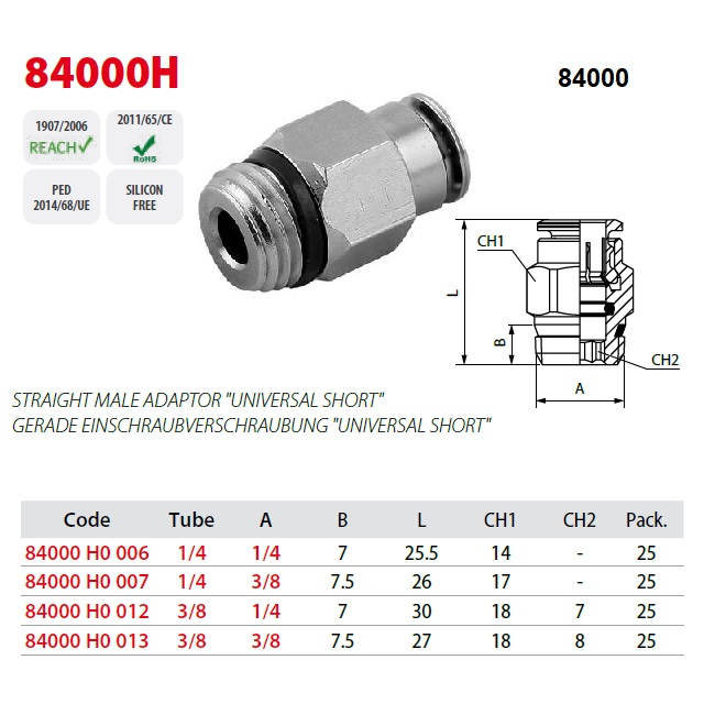 Varianty84000H0006; Provozní tlak (bar) 85, Série 84000, Vnější závit R1/4", Hmotnost (kg) 0,01, Šestihran 14, Výška , Hadice d/D 1/4"