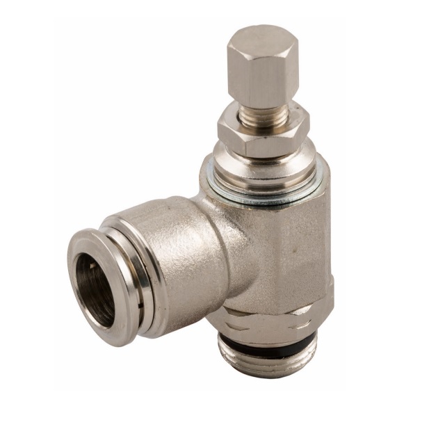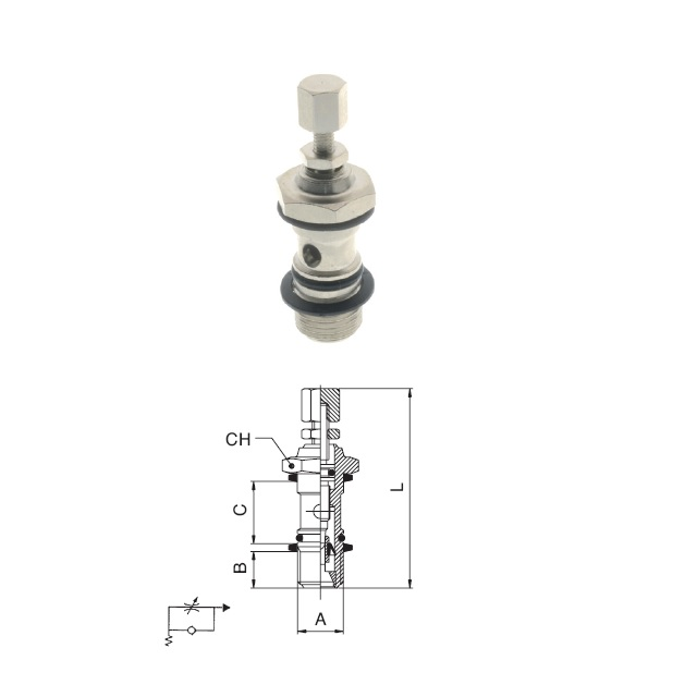 Jednosměrný škrtící ventil pro škrcení na výstupu (z válce), ruční regulace pomocí ovládacího šroubu. Tělo tohoto výrobku lze použít u aertiklu ze série 13000, artikl. 32775: 13550BI, na místo "PRŮTOKOVÉHO ŠROUBU".