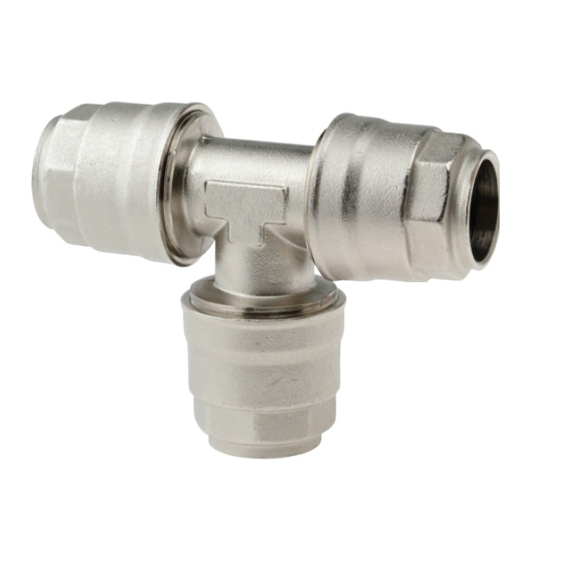 Spojka T, typ PUSH-IN.Tělo a matice z poniklované mosazi, břit z nerezové oceli, bezpečnostní kroužek z technopolymeru, těsnění NBR.Rychlospojka pro systém rozvodu vzduchu, médium - vzduch a vakuum.