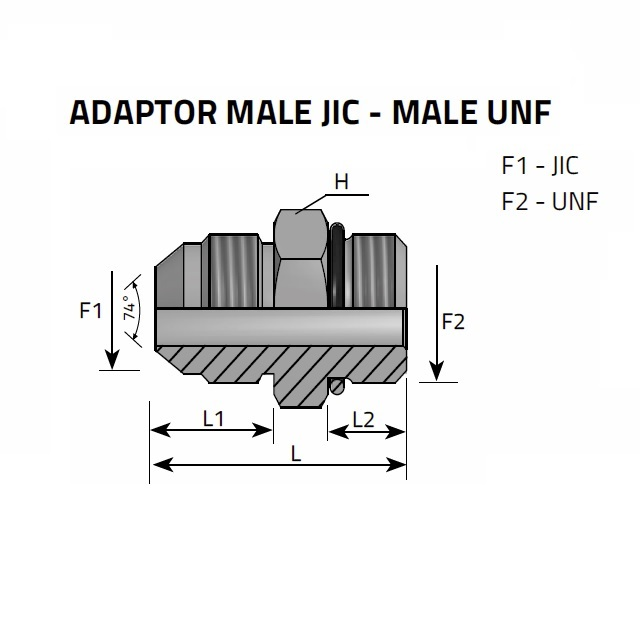 AMJ12MU12; Celková délka (mm) L=50,0, Provozní tlak (bar) 240, Vnější závit JIC 1.1/16-UNF1.1/16, Hmotnost (kg) 0,058, Šestihran 32, Výška