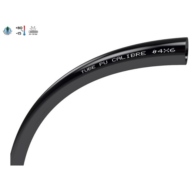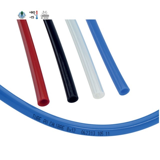 PU kalibrovaná hadička pro dopravu stlačeného vzduchu a vzduchové rozvody v pneumatice. Na přání zákazníka dodáváme k hadicím speciální spojky a rychlospojky. U hadice je přesně kalibrován vnější průměr, který je nejdůležitější při objednávání hadice.Tolerance přesnosti vnějšího rozměru u průměru 3 až 8 mm je 0,1 mm a u průměru 10 až 14 je 0,15 mm. Všechny parametry uvedené v tabulce jsou při 20°C. Vyšší teplota má za následek snížení provozního tlaku.