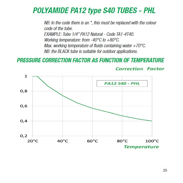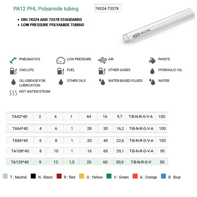 * - D = vnější kalibrovaný průměr hadiceParametry uvedené v tabulce jsou vztaženy k teplotě 23°C.Další rozměry viz AEROTEC PA-12 TRANS.S40 PH artikl 10697 (některé bez normy), viz katalový list výrobce