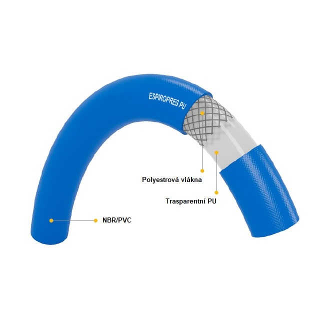 Hadice pro tlakový vzduch pro všeobecné průmyslové aplikace, pro přívod vzduchu pro pneumatické nářadí, stříkací pistole na malování.Odolává tukům, olejům, potravinářským kapalinám, ozónu i lehkým chemikáliím.Hadice je odolná proti zalomení, velmi flexibilní, odolná otěru a mechanickému namáhání. Uvedené parametry platí při teplotě 20°C.