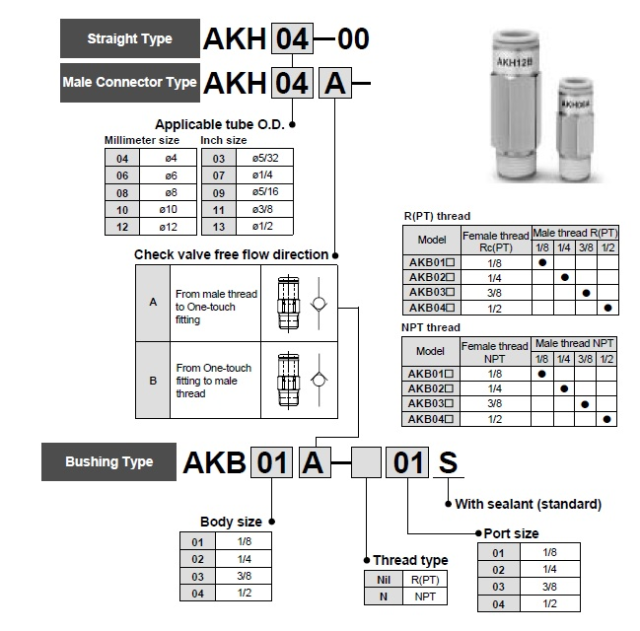 VariantySMC-AKH04B-M5; Podtlak (kPa) 100, Provozní tlak (bar) 10, Série AKH-metrická, Vnější závit M5x0,8, Ventil ANO, Hmotnost (kg) 0,005, Určeno na hadici [mm] *D4, Určeno na hadici [*D] 10