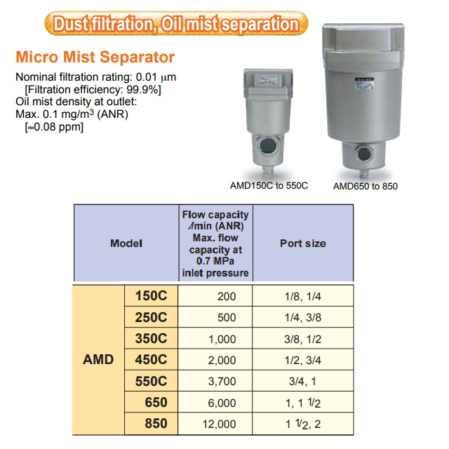 AMD150C-550C/AMD650-850, Submikrofiltr pro modulární spojení.Typy závitů: Rc, G, NPT. Připojovací závity: 1/8", 1/4", 3/8", 1/2", 3/4", 1", 1.1/2", 2".Volitelné : na konci kodu s "T" - s ukazatelem znečištění filtrační vložky (AMD150C-02D-T).Velikosti tělesa jsou uváděny také s výkonem motoru pro tuto sérii, např. 2,2 nebo 3,7 kW apod.Např. největší série "850" se 2" závity (AMD850-20D-T) požaduje výkon motoru 75 kW.Volitelné jsou držáky - upevňovací úhelníky "B" (bracket). "C" - automatický odlučovač kondenzátu typu N.C., "D" automatický odlučovač kondenzátu typu N.O.Kombinace -úhelník + typ je uvedená dohromady...např. "BD" PŘ. AMD250C-03BD-T nebo "AMD250C-03BD" bez ukazatele.