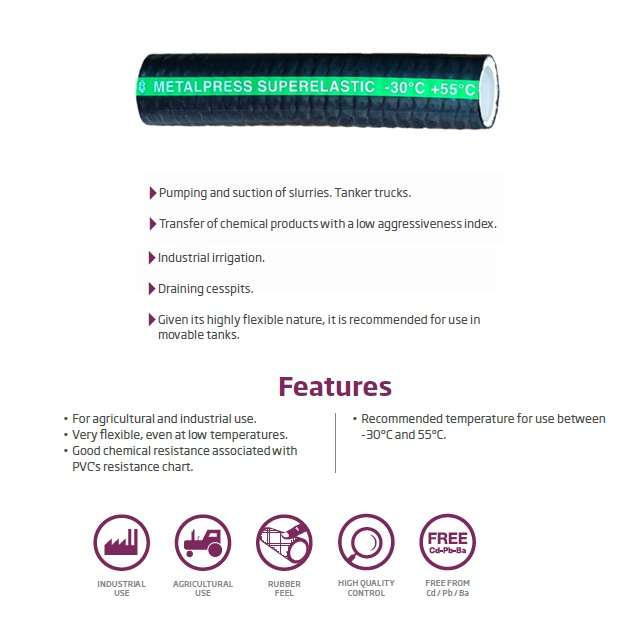 NBR/PVC hadice s dvojitou textilní výztuhou a kovovou spirálou pro sání a výtlak kapalin v zemědělství a průmyslu.Např. čerpání a sání kalů pro cisternové vozy, přeprava chemických produktů s nízkým indexem agresivity, průmyslové zavlažování, odvodňování žump.Vzhledem ke své vysoké flexibilitě se doporučuje použití v mobilních nádržích.Velmi flexibilní i při nízkých teplotách a dobrá chemická odolonost.