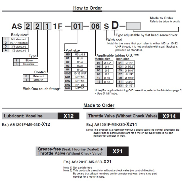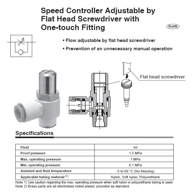 AS*2*1F-D, Škrticí ventil se zpětným ventilem, pro všeobecné použití, s nástrčnou spojkou a se zapuštěným šroubem, horizontální přívod.Volitelné parametry: Velikost připojovacího závitu: M5, 10-32 UNF, 1/8, 1/4, 3/8, 1/2".Vnější průměr hadice: 3,2 až 12 mm, 1/8" až 1/2".Rozsah provozního tlaku: 0.1 až 1 MPa (1 až 10 Bar).Size velikosti tělesa: "AS1" - se závity M5, "AS2" velikosti 1/8"+1/4", "AS3" velikost 3/8", "AS4" 1/2", Všechny typy jsou úhlové 90° se zapuštěným šroubem pro seřízení šroubovákem.Standardní škrcení výstupu (kodem 0) ...AS220**, nebo vstupu (kodem 1) AS2211*.