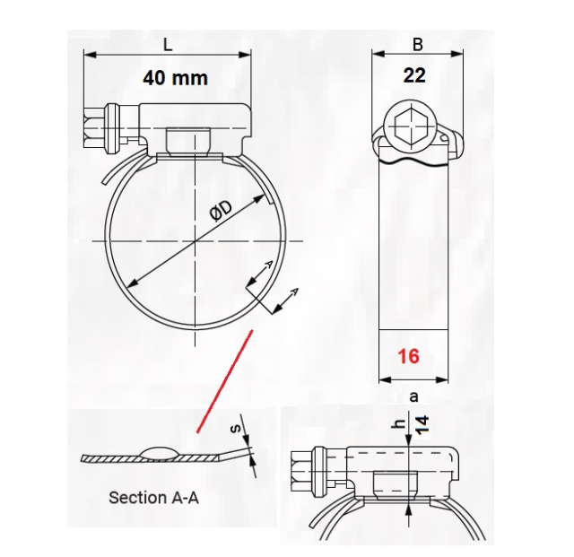 Spony s vysoce výkonným utahovacím momentem a vylepšenou konstrukcí zámku s dvojitou upevňovací výztuhou. Díky konstrukci nového 8 mm šestihranného šroubu a šířce pásku 16 mm můžeme zvýšit utahovací moment o více než 118 % ve srovnání s rozsahem šířky S 12 mm.Přitom jde o zvýšení výkonu o 48%! Spony jsou navrženy a vyrobeny s dokonale zaoblenými hranami pásku.Díky svému vysokému výkonu jsou spony zvláště vhodné pro průmyslové aplikace v automobilovém sektoru. Pokrývají všechny aplikační průměry hadic od 25 do 206 mm.V některých případech je možné považovat spony za náhradu čelisťových spon GBS.Výhodou je možnost rozevření spony bez demontáže koncovky od hadice, rychlost montáže a možnost zdvojení spon na krátkém toulcovém nátrubku. Materiál: Pás a pouzdro: Nerezová ocel X5Cr Ni1810 (AISI 304), Šroub: Nerezová ocel (AISI 304).