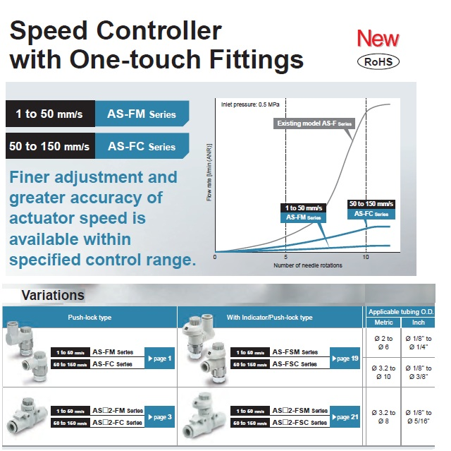 AS*FM/FC, Škrticí ventil se zpětným ventilem, vysoká přesnost.Nástrčná spojka s aretačním točítkem, horizontální / vertikální přívod. Volitelné parametry:Velikost připojovacího závitu: M5, 10-32 UNF, 1/8, 1/4".Vnější průměr hadice: 2 až 10 mm, 1/8"" až 3/8".Rozsah provozního tlaku: 0.1 až 1 MPa (1 až 10 Bar).Tvar ventilu: Standardní do 90° je řada AS22**, cca obrácené Z je speciální výstup vedený stejným přímým směrem AS23**.Standardní škrcení výstupu (kodem 0) ...AS220**, nebo vstupu AS2211**. Stejné pravidlo je pro řadu AS23.Rozsah přesného řízení 1 až 50 mm/s má v kodu FM (8. až 9. řád), 50 až 150 mm/s je značen FC, příklad celého kódu: AS2211FC-G02-06A.Standardní závity G, jsou bez těsnění (AS2211FM-G01-06A), při volbě kuželového závitu "R" jsou dvě možnosti (s těsněním př: AS2211FM-01-06SA) nebo bez těsnění: AS2211FM-01-06A.