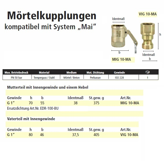 Určeno pro zařízení na výrobu a transport betonových, omítacích a maltových směsí. K rozvodům maltových a betonových směsí na čerpadlech, stříkacích zařízeních a omítkovacích strojích.Spojovat lze pouze spojky se stejnými velikostmi spojek.Drážkovaná kontura trnu pro lepší uchycení hadice. Celá řada spojek je certifikována TÜV.Těsnění Perbunan 55 Sh je součástí koncovky.