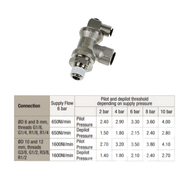 7880-0813; Provozní tlak (bar) 10, Připoj. závit G 1/4, Trubka (mm) D-8 mm, Hmotnost (kg) 0,127, Velikost [modul] Pil.D=4, Šestihran 21, Ovládání Tlak 1/0, Kóta B 53