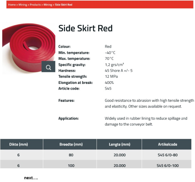 Použití k zamezení vysypání předmětů dopravované na dopravním pásu. Dobrá odolnost proti oděru s vysokou pevností v tahu a elasticitou. Jiné rozměry k dispozici na vyžádání.