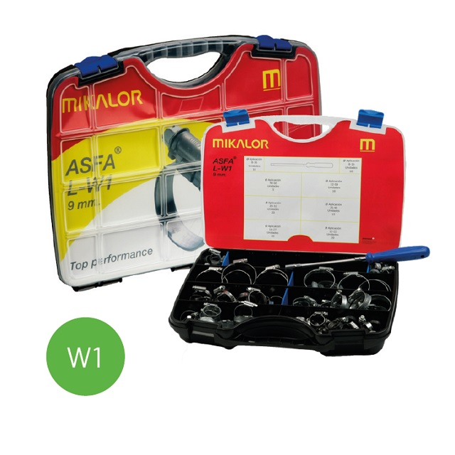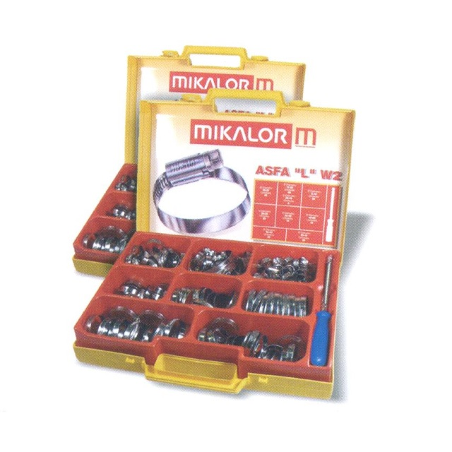 Box se šnekovými spony.Materiál W1 a W2 šířka pásku 9 mm: 8-16 mm (60 ks), 12-22 (40 Ks), 16-27 (40 ks), 20-32 (20 ks), 30-45 (20 ks), 32-50 (10 ks), 40-60 (10 ks), 50-70 (6 ks).Krabice na sortiment ASFA L (9 mm) a ASFA S (12 mm) jsou ideální pro všechny vaše potřeby hadicových svorek. Tato řada sortimentních krabic pokrývá všechny dostupné vlastnosti materiálu. Robustní plastové pouzdro je také velmi vhodné pro přepravu produktu a znamená, že máte vždy k dispozici nejčastěji používané rozměry. Vložka obsahuje informace o umístění každého průměru uvnitř krabice. Každá krabička obsahuje flexibilní šestihranný šroubovák, kterým lze utáhnout spony.Na poptávku možný box i z materiálu W4, W5 šířka pásku 9 mm (stejné rozměry a množství).Na poptávku možný box i z materiálu W1, W2, W4 šířka pásku 12 mm (jiné rozměry a množství).Na poptávku možný box i z deformačními sponami Ear Clip s dvěmi oušky W1 nebo W4.