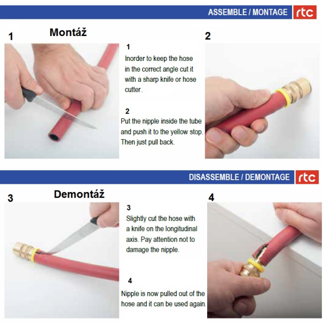 Hadice nástrčného systému Lock-On nebo Push-Lock, pro temperovací stroje nebo stroje udržující stálou vysokou teplotu.Hadice je nutno objednávat ve 30 metrových baleních.Vysoká bezpečnost hadice: poruchové tlaky 3/8" a 1/2"=200 Bar, 5/8" = 140 BarHadice neobsahují složky silikonu a pro hadicové trny se aplikují bez použití upínacích svorek.Průměry hadic modulu 3/4" a 1" je nutné konzultovat limitní množství pro výrobu.