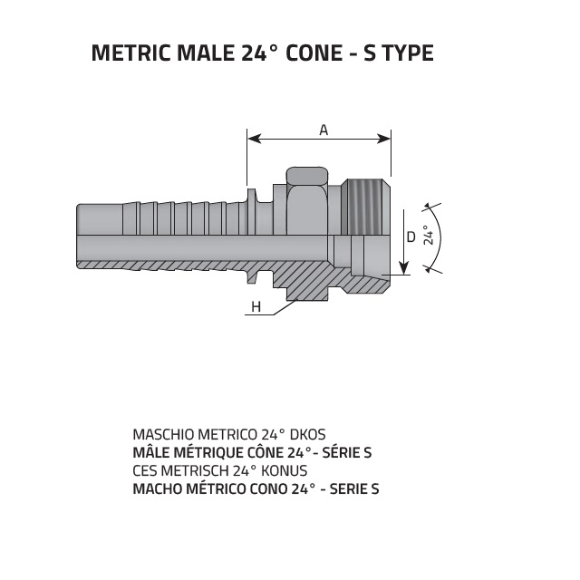 Lisovací nátrubek pro hydraulické hadice CES. Protistrana - vnější závit DKOS, kuž. 24°, těžká řada.Pro výběr koncovky k patřičnému průměru hadice slouží údaj "Určeno na hadici (Inch)". Tabulkový údaj "Trub. (mm)" - uvádí protikus "trubku", do které koncovka zapadá kuželem.