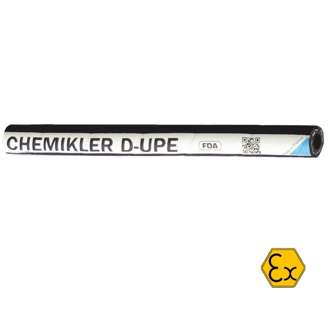 Hadice na vypouštění prakticky všech korozivních chemikálií: silných kyselin, vysoce aromatických rozpouštědel, chlorovaných nebo okysličených rozpouštědel, aromatických uhlovodíků atd.Pro mobilní nebo pevné instalace v chemických závodech a souvisejících průmyslových odvětvích.UPE - chemicky odolný UPE (polyethylen s ultravysokou molekulovou hmotností), černý, hladký, elektricky vodivý.Plášť hadice je z EPDM, antistatická R=<10 na 6 Ohm/m. Snadné mytí hadice až do +140°C po dobu 30 minut. Vynikající odolnost proti stárnutí, atmosférickým podmínkám a ozónu. Optimální odolnost potahu proti oděru a chemikáliím.Tato hadice byla zkontrolována a schválena francouzským schvalovacím úřadem INERIS pro použití ve všech oblastech ATEX. Pro doplnění další podmínky normy ATEX je zapotřebí použití schválených koncovek, aby celé zařízení bylo kompaktně elektricky vodivé jako jeden celek. Veškeré montáže musí být provedeny odborně.Norma: EN 12115:2011, UPE - FDA.