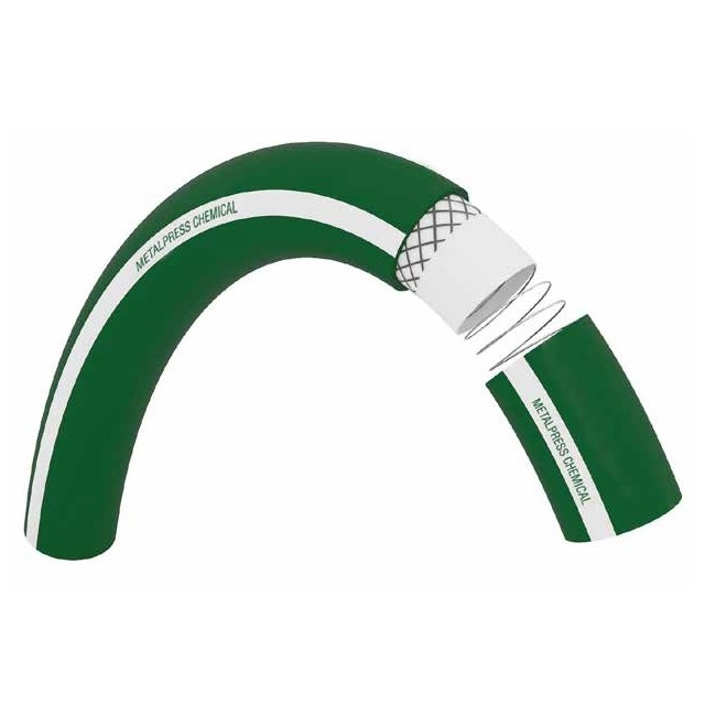 Vnitřní výztuha s pozinkovanou ocelí, pevná kovová spirála, vyztužena polyesterovým vláknem pro větší odolnost vůči provozním tlakům.Termoplastická pryžová (TPV) hadice s dvojitou výztuhou pro sání a přepravu produktů v chemickém průmyslu.Hadice neobsahuje ftaláty ani těžké kovy.Oblast použití: průmysl i zemědělství.