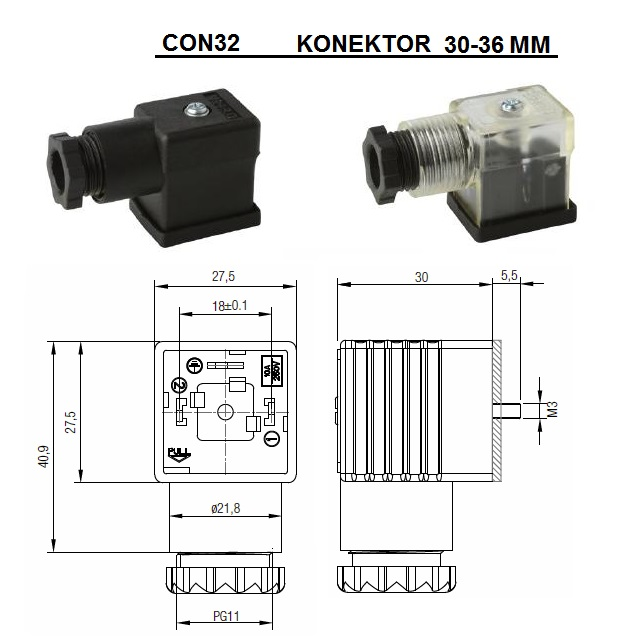 CON3100001; DN (mm) 36, D.* (mm) 30-36, Napětí 0-220V, Hmotnost (kg) 0,022, Ovládání Přív. kabelem, Barva Černý (2 PIN)