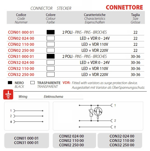 CON3211000; DN (mm) 36, D.* (mm) 30-36, Napětí 110V, Hmotnost (kg) 0,026, Ovládání Přív. kabelem, Barva LED-Transp.110V