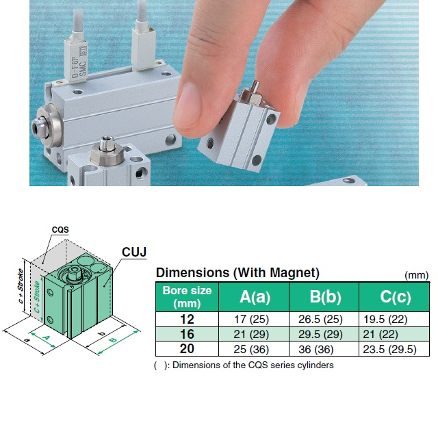 Miniaturní válec pro přímou montáž – řada CUJ.Prostorově úsporný – délka 13 mm a výška 15 mm (pro průměr pístu 4 mm).Průměry pístu: 4, 6, 8, 10, 12, 16, 20 mm.Snadná instalace – možnost montáže snímačů polohy a přívod stlačeného vzduchu z jedné strany.Detekce polohy pístu – přímá montáž snímačů polohy do drážek v profilu pohonu.Maximální zdvih: 50 mm, přímá montáž válce ze 4 stran. Naúř. boční montáž: "B": přiklad CUJB* (CUJB8-15DM), kde DM - D- dvojčínný a M je pístice s vnějším závitem, 15 = zdvih v mm. Přímá montáž snímačů polohy do drážek v profilu pohonu.