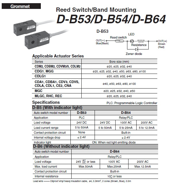 D-B53/B54/B64, Jazýčkový snímač polohy, montáž páskem, měděné vodiče.Elektrické připojení: kabel 0,5 m, L= délka 3 m, Z= délka 5 m (příklad: D-B53Z).Pro pohony řady: CDM2, CDBM2, CDVM3/5, CDLM2, CDG1, MGG, CDLG1, CDA1, CDBA1, CDV3, CDVS, CDLA, CDL1, CE2, CNA, MGC, MLGC, RHC, REC.Napájecí napětí: 100V, 200 V/AC / 24 V/DC. Max. proud: 5 až 50 mA.Řady B53 a B54 jsou vybaveny indikační diodou /při detekci napětí svítí dioda červeně).Řada B6* nemá indikační diodu a vnitřní odpor je < 10 Ohmů.